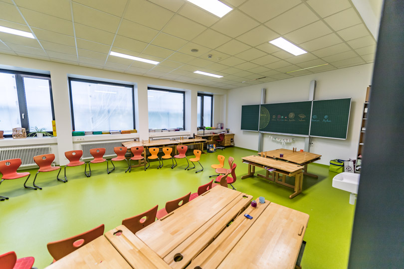 Connectivity of the buildings via KNX bus and remote control allows for significantly better energy management. Due to intelligent bus control technology, it is possible to optimise the building in case of overheating in summer and cooling down in winter. Furthermore, different sensors (wind, rain, sun etc.) enable intelligent intervention in the respective daily routine of the various users. Reprogramming of various scenarios can be carried out quickly. Different actual values (CO2 content, temperature, air humidity) can be recorded by means of sensors in the classrooms. On this basis active intervention is possible with regard to shading or regulation of the ventilation system. This allows for a significantly better indoor climate in the classrooms.