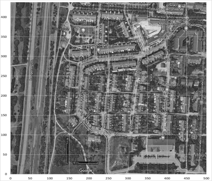 A small district in the north of Darmstadt, Germany, was selected to be used as an example (Figure 2). The district covers an area of about 350 x 350 m. The railway line and the ring road on the western side are separated by a landscaped noise barrier approximately 20 m high.