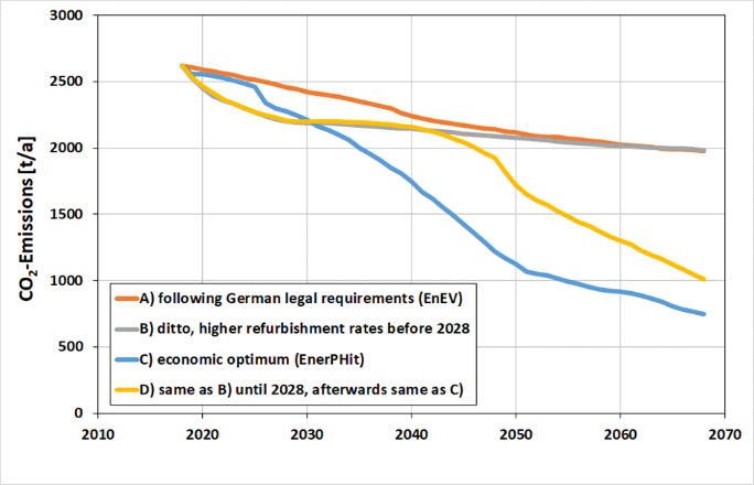 Figure 3 and Figure 4 illustrate the resultant CO2 emissions for space heating and hot water production (the power consumption is initially not taken into consideration here). It should first be noted that even after 50 years, only moderate reductions in emissions were achieved in the variant A).