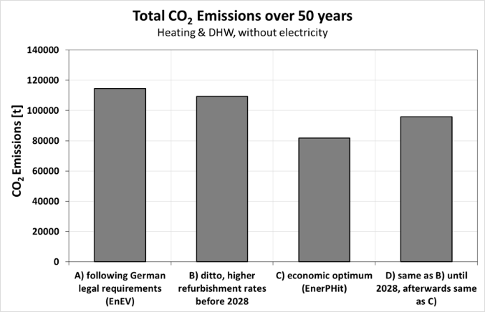 Figure 4: In view of the sum total over 50 years, the lowest CO2 emissions are achieved through consistent EnerPHit retrofitting as part of the maintenance circle |