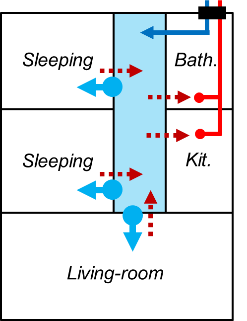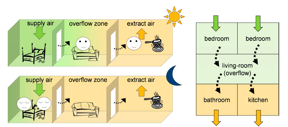 Active overflow may be useful especially for retrofitting because an even more extensive reduction of the duct network may be achieved. In order to do so, small fans are implemented to deliver air from corridors to bed- and living rooms.