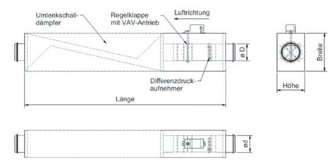 Besides the heat recovery unit itself, also the air distribution boxes and silencers should be as flat as possible, if they should be integrated within the suspended ceiling. In case of centralized ventilation systems, each dwelling is equipped with two volume flow controllers. In order to save as much space as possible and to save installation costs at the same time, the combination of volume flow controller, silencer and air distribution box is a good solution (see next figure).