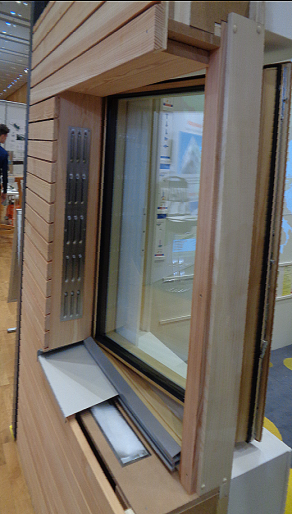 This principle was adopted by the Smartshell refurbishment solution of Franz Freundorfer, which was shown at the Passive House Conference Exhibition in 2017 (see next figure). In this case the open larch casing works as ventilation grill, the outdoor air is sucked through and is ducted to the horizontal air filter below the window sheet.