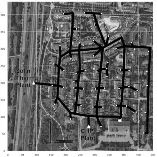 In the calculation, the area will now be provided with a district heating grid at usual operating temperatures (110 °C for winter and 80 °C for summer) (Figure 5). The heat is predominantly generated by a gas-driven CHP plant located near the supermarket with an overall efficiency of 85% (55% thermal and 30% electrical). The CHP plant is heat-driven and is designed to operate at a thermal output of 3.3 MW so that it generates approximately 3,000 full-load hours in the initial state of the district.
